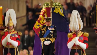 King Charles III, Princess Anne, Prince Andrew and Prince Edward stood with their backs to the flag-draped coffin of Queen Elizabeth II, their heads bowed.