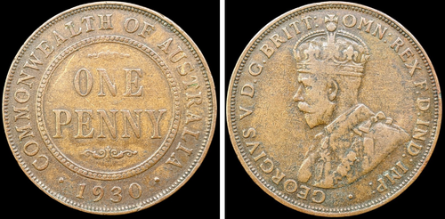 The 1930 penny, made earlier than Australia had switched to decimal forex, options the top of King George V, the grandfather of Queen Elizabeth II.