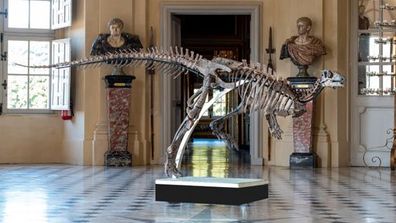 Jurassic-era dinosaur skeleton headed below hammer