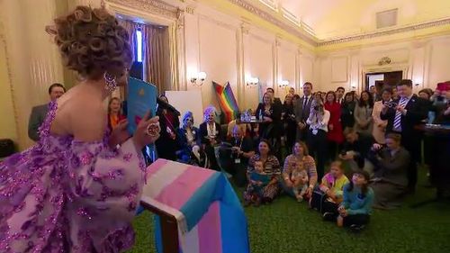 The same occasion was held at Victoria's parliament, with entertainer Dean Arcuri, also called Frock Hudson, studying to kids and politicians.